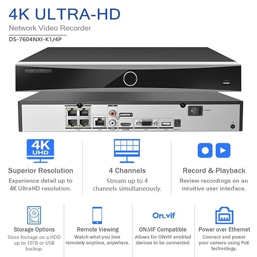 - (HARD DRIVE NOT INCLUDED) S.h.i.p. from. U.S. ware-house. This 4K 4 Channel PoE NVR of model: DS-7604NXI-K1/4P from Hik-vision factory, Upgraded model of DS-7604NI-K1/4P, International Original English Version, support upgrade firmware. We provide 2-year warranty and life-t-ime support for users. If you have any needs, please do not hesitate to contact us at any time. (Warm tips: If your camera is already active in use, it is recommended that you reset the camera before connecting to the new NVR)