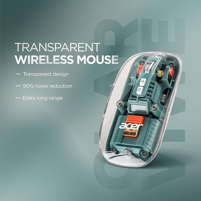 Acer Clearview Transparent Wireless Mouse with Triple-Mode Connectivity, Silent Click Tech, Metal Scroll Wheel,1600 DPI Optical Sensor, USB-C Charging, Compatible Windows, MacOS, iOS, Android-Green