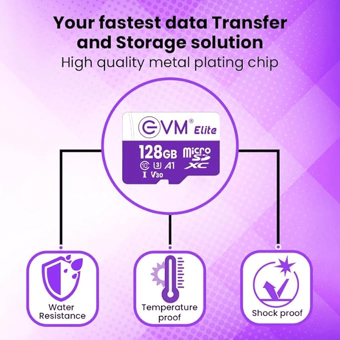 EVM Elite 128GB MicroSDXC Class 10 U3 V30 Memory Card – 100 MB/s Read Speed – CCTV Camera, Mobile, Drone – 5 Years Warranty (EETF/128GU1)