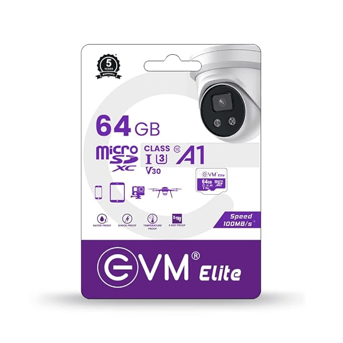 EVM Elite 64GB MicroSDXC Class 10 U3 V30 Memory Card – 100 MB/s Read Speed – CCTV Camera, Mobile, Drone – 5 Years Warranty (EETF/64GU1)